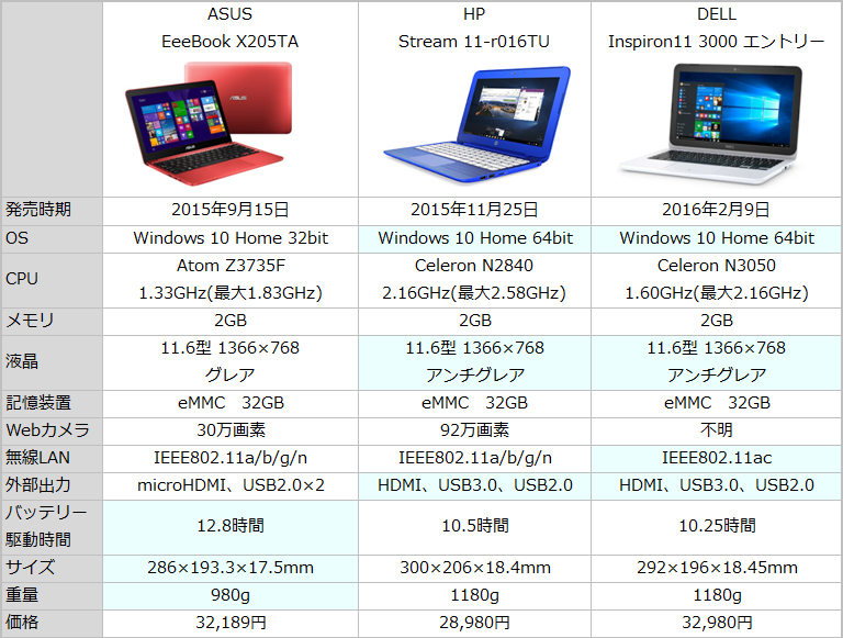 HPとDELLの2機種はスペックはほぼ同じ。HPはカラーが青のみ。